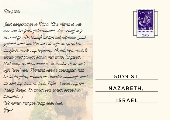 1 Op de derde dag werd er een bruiloft gevierd te Kana in Galilea, waarbij de moeder van Jezus aanwezig was. 2 Ook Jezus en zijn leerlingen waren op de bruiloft uitgenodigd. 3 Toen de wijn opraakte, wendde de moeder van Jezus zich tot Hem en zei: ‘Ze zitten zonder wijn.’ 4 Jezus antwoordde: ‘Wat hebben ik en u daarmee van doen, Vrouwe? Mijn uur is nog niet gekomen.’ 5 Zijn moeder zei tegen de dienaren: ‘Wat Hij u ook beveelt, doe het maar.’ 6 Nu stonden daar zes stenen waterbakken ten behoeve van het Joodse reinigingsgebruik, elk met een inhoud van twee tot drie metreten. 7 ‘Doe die bakken vol water,’ beval Jezus hun. Ze deden ze vol water, tot de rand toe. 8 Vervolgens zei Hij: ‘Schep er nu wat uit en breng het naar de tafelmeester.’ En ze deden het. 9 De tafelmeester proefde het water dat wijn was geworden, maar wist niet waar die vandaan kwam; de dienaren die het water geschept hadden wisten het wél. De tafelmeester riep dus de bruidegom 10 en zei: ‘Iedereen schenkt toch eerst de beste wijn, en de gewone pas wanneer er al flink gedronken is. Maar u hebt de beste wijn bewaard tot het laatst!’ 11 Dat was het begin van Jezus’ tekenen, te Kana in Galilea. Hij openbaarde zijn heerlijkheid en zijn leerlingen geloofden in Hem.